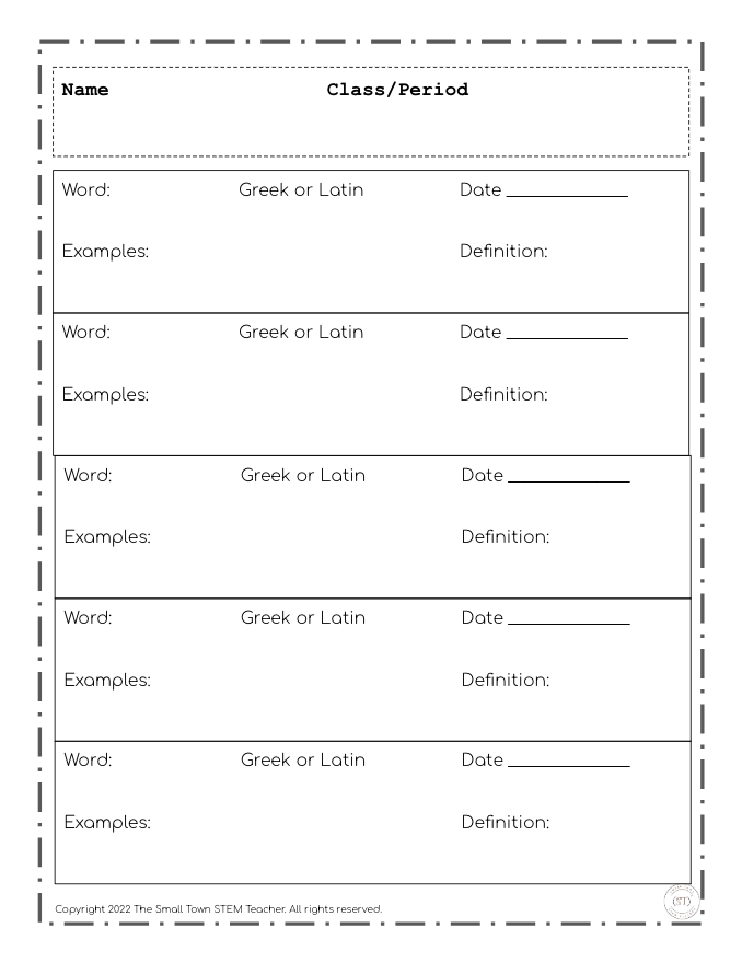 I treat this assignment as something fun and non-stressful. I tell students that they will receive a grade for completing the worksheet, and it will not count against them if they make a mistake. My only requirement is that they complete all portions of the worksheet (date, root word, Latin or Greek, at least one example, and the definition of the root). I also do not allow students to fill in missed days – I want them to be a part of the discussion, and it encourages them to both be in class and be on time!